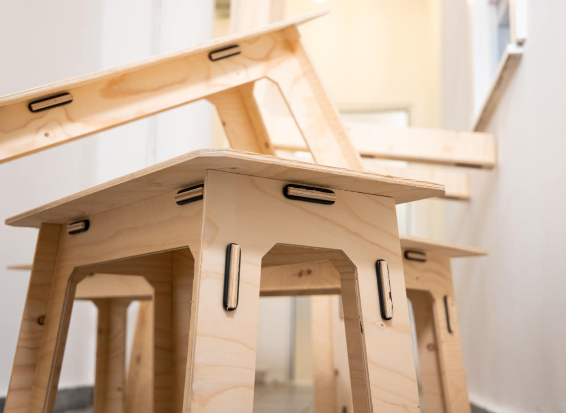 Die Werkhaus-Möbel sind Universaltalente und können als Tisch, Hocker, Sitzbank oder Ablagefläche genutzt werden. Durch das Stecksystem sind sie einfach zusammen- und auseinanderbaubar. Die Gummiringe kommen zudem ganz ohne Weichmacher aus.